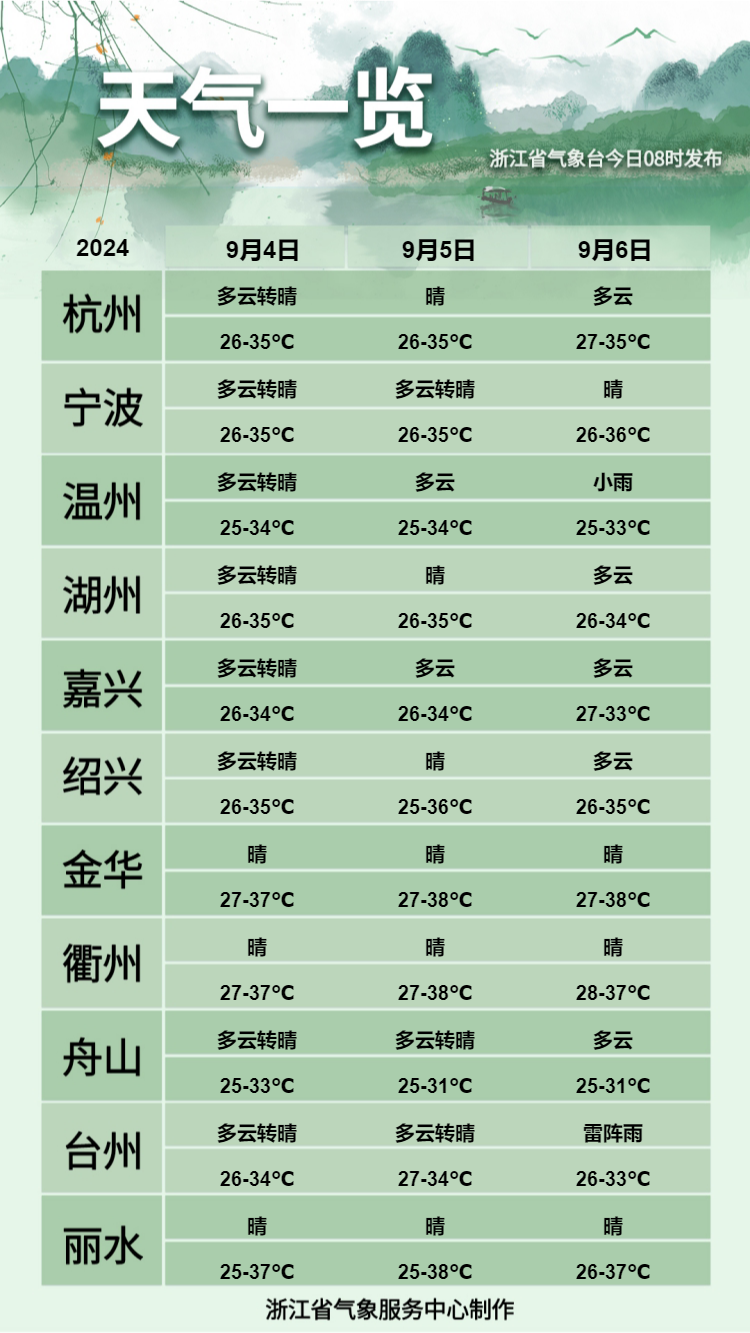 受副热带高压操控,今日(9月4日)浙江高温仍然盛行。一早气温就不低,遍及在27-29℃左右,10时,全省大部气温30-32℃。