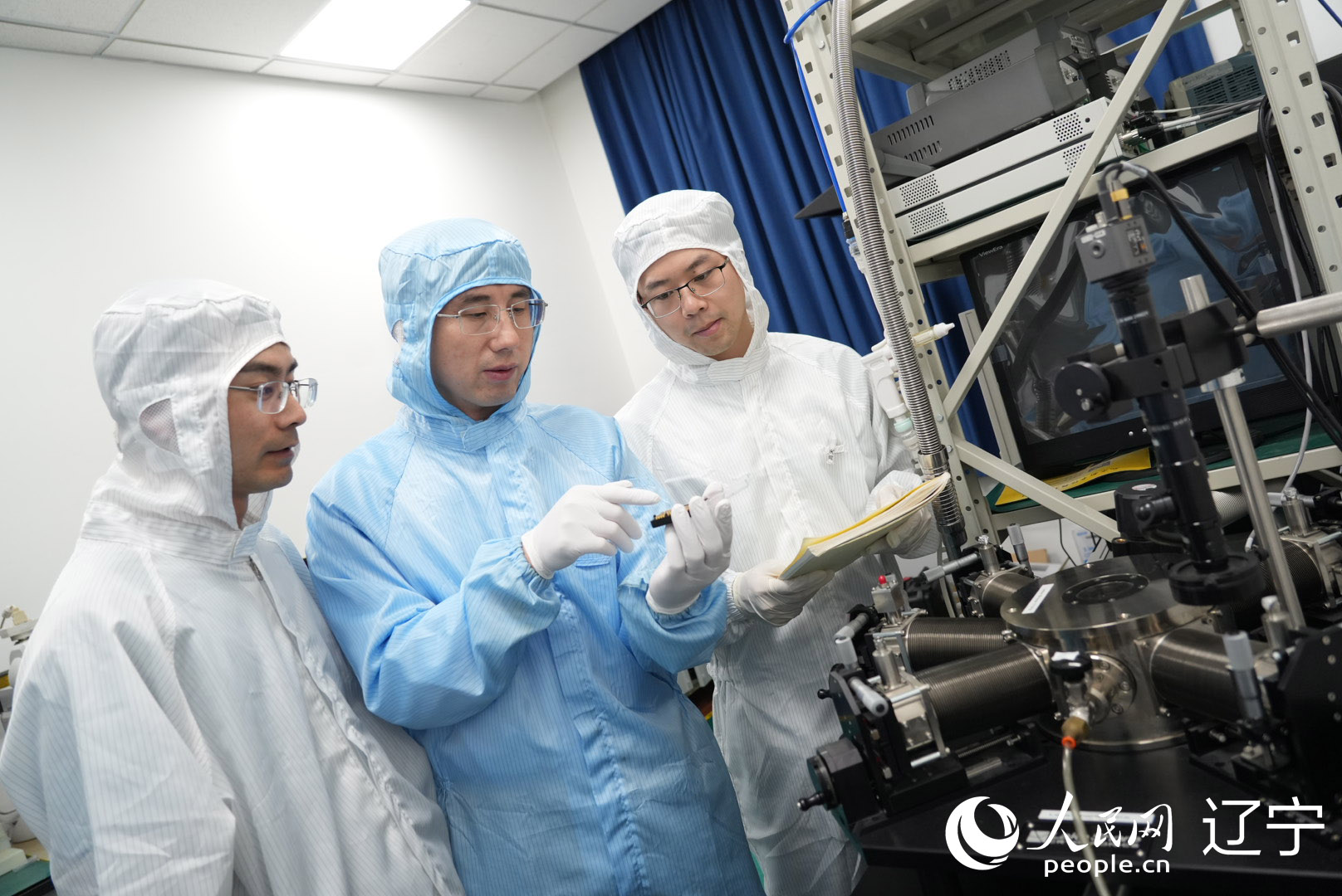 在中国科学院金属研究所纳米碳基电子器件超净实验室内,孙东明与助手在讨论试验样品。人民网记者 周颂雪摄