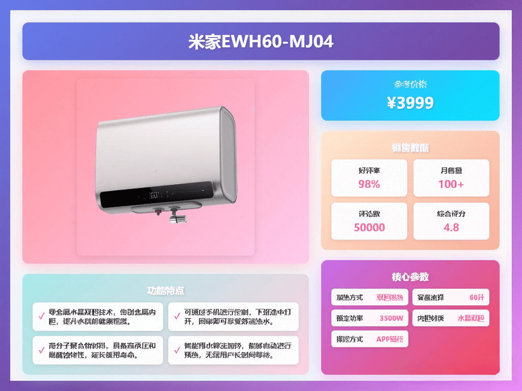 这款米家EWH60-MJ04电热水器采用水晶双胆技术,打破传统金属内胆的限制,有效避免锈蚀和水垢,保障水质健康。配备的米家焕活净化瓶,达到99.5%的阻垢率,可以持续净化水源,减少内胆和管路的水垢堆积。同时,支持富锶汤泉浴,富含矿物元素,有助于改善肌肤质感,沐浴体验更添一份养生享受。